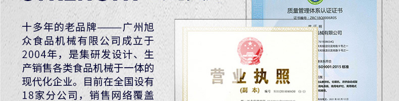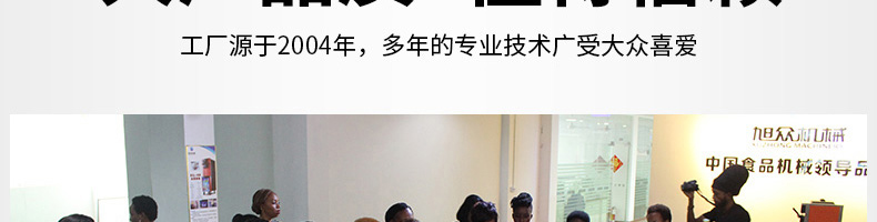 廣州旭眾食品機械有限公司是一家集科研開發(fā),生產(chǎn)設計,營銷服務為一體的現(xiàn)代化生產(chǎn)企業(yè)。現(xiàn)代化生產(chǎn)車間,精湛制造技術,所產(chǎn)機械歷經(jīng)市場重重考驗,不斷贏得海內(nèi)外客戶的贊譽。