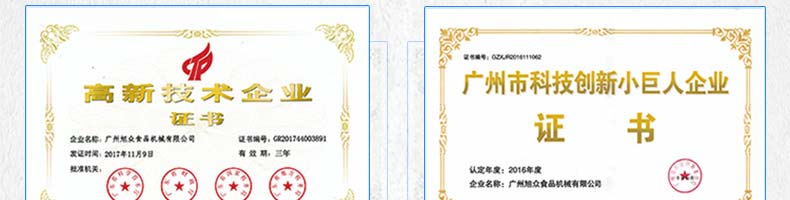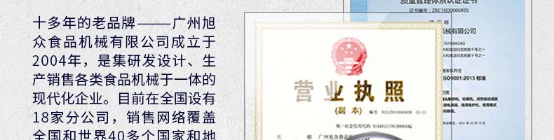 廣州旭眾食品機(jī)械有限公司是一家集科研開發(fā),生產(chǎn)設(shè)計,營銷服務(wù)為一體的現(xiàn)代化生產(chǎn)企業(yè)?,F(xiàn)代化生產(chǎn)車間,精湛制造技術(shù),所產(chǎn)機(jī)械歷經(jīng)市場重重考驗(yàn),不斷贏得海內(nèi)外客戶的贊譽(yù)。