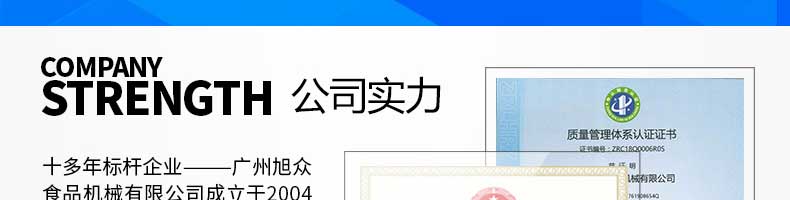 廣州旭眾食品機械有限公司是一家集科研開發(fā),生產(chǎn)設計,營銷服務為一體的現(xiàn)代化生產(chǎn)企業(yè)?,F(xiàn)代化生產(chǎn)車間,精湛制造技術,所產(chǎn)機械歷經(jīng)市場重重考驗,不斷贏得海內(nèi)外客戶的贊譽。