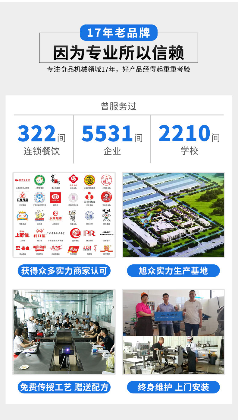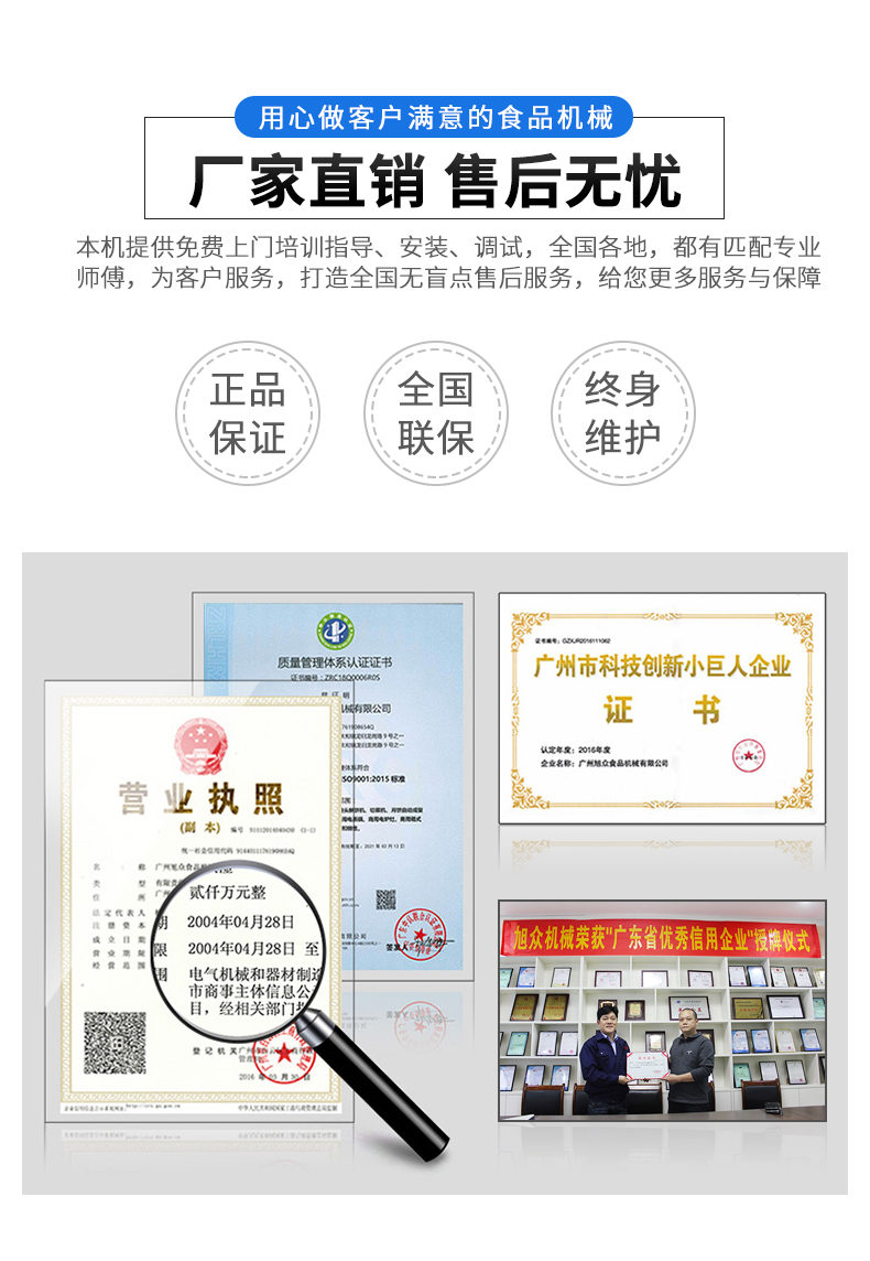 廣州旭眾食品機械有限公司是一家集科研開發(fā),生產(chǎn)設(shè)計,營銷服務為一體的現(xiàn)代化生產(chǎn)企業(yè)。現(xiàn)代化生產(chǎn)車間,精湛制造技術(shù),所產(chǎn)機械歷經(jīng)市場重重考驗,不斷贏得海內(nèi)外客戶的贊譽。