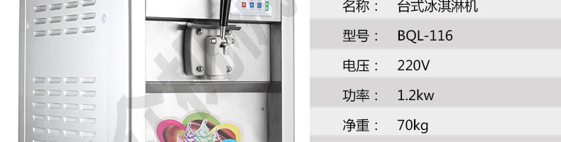 BQL-116臺式冰淇淋機(jī),●選用國際名牌成熟制冷配套件和高效壓縮機(jī),融合旭眾精湛工藝輔以嚴(yán)格的質(zhì)量控制流程,使產(chǎn)品整體性能及品質(zhì)得以全面提升?!癫捎萌珨?shù)字電腦控制系統(tǒng),選用名牌優(yōu)質(zhì)電器元件,先進(jìn)的生產(chǎn)工藝,故障診斷,軟硬任意調(diào)制,自動修復(fù)功能,安全精確,可靠性更高?!駥I(yè)成熟制冷系統(tǒng)設(shè)計,選用世界名牌大功率專用壓縮機(jī),大大縮短冰淇淋成型時間,相同時間內(nèi)冰淇淋產(chǎn)量大幅度增加,使您生意火爆時依然得心應(yīng)手,為您創(chuàng)造財富?!癜踩椒€(wěn)的機(jī)械攪拌系統(tǒng),噪音更低、振動更小,使整機(jī)運(yùn)行性能達(dá)到國際先進(jìn)水平?!翊_保進(jìn)料溫度在0°C~35°C;環(huán)境溫度5°C~40°C勻可正常使用。