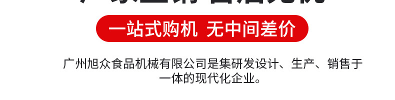 廣州旭眾食品機械有限公司是一家集科研開發(fā),生產設計,營銷服務為一體的現(xiàn)代化生產企業(yè)?,F(xiàn)代化生產車間,精湛制造技術,所產機械歷經市場重重考驗,不斷贏得海內外客戶的贊譽。