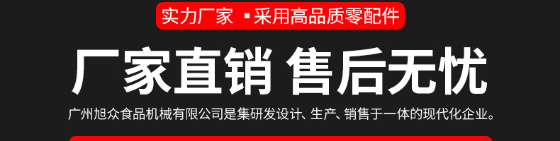 廣州旭眾食品機(jī)械有限公司是一家集科研開(kāi)發(fā),生產(chǎn)設(shè)計(jì),營(yíng)銷服務(wù)為一體的現(xiàn)代化生產(chǎn)企業(yè)。現(xiàn)代化生產(chǎn)車(chē)間,精湛制造技術(shù),所產(chǎn)機(jī)械歷經(jīng)市場(chǎng)重重考驗(yàn),不斷贏得海內(nèi)外客戶的贊譽(yù)。
