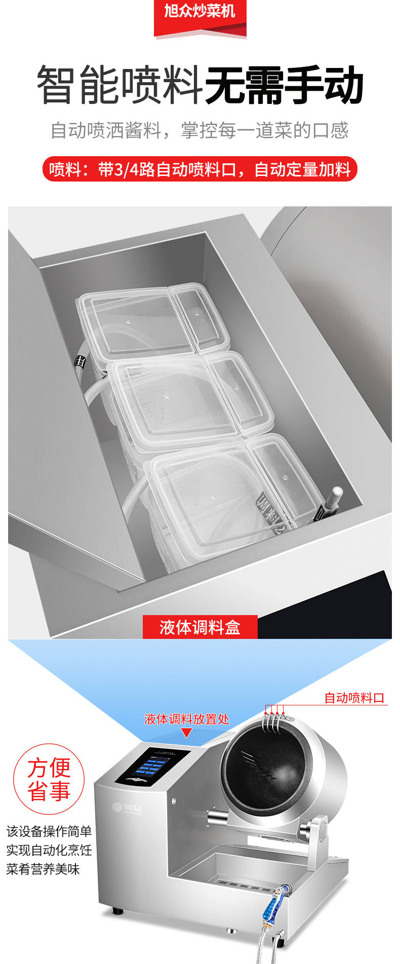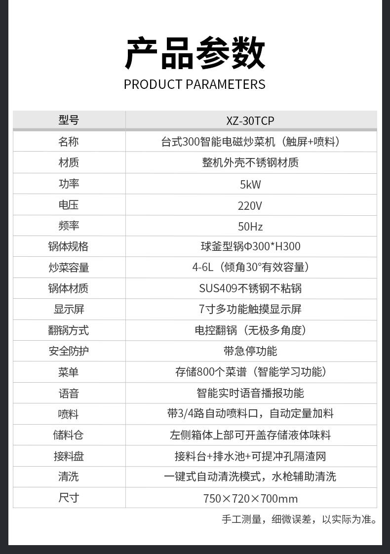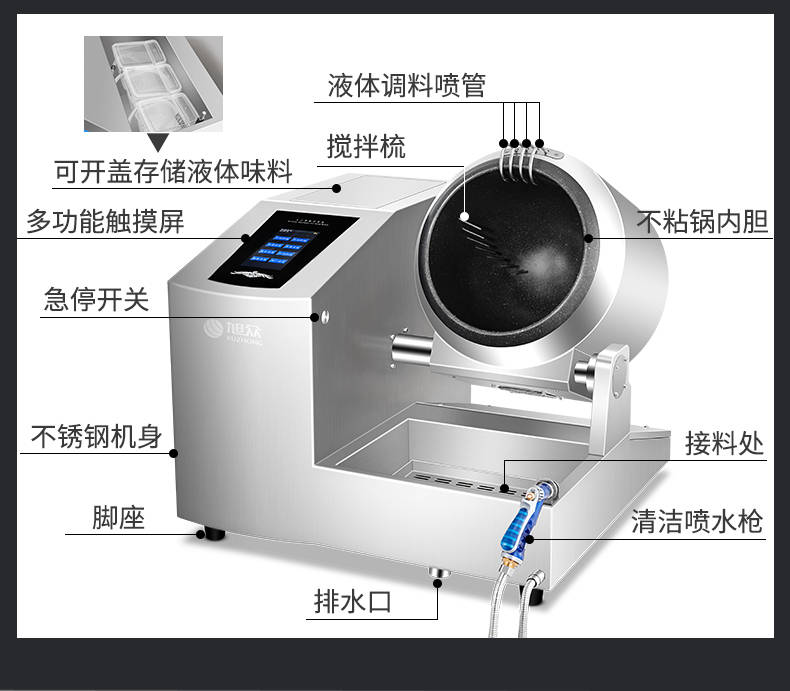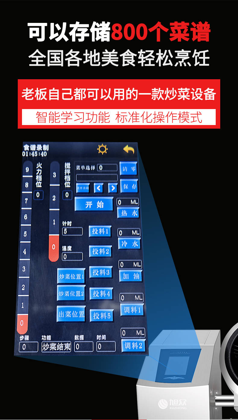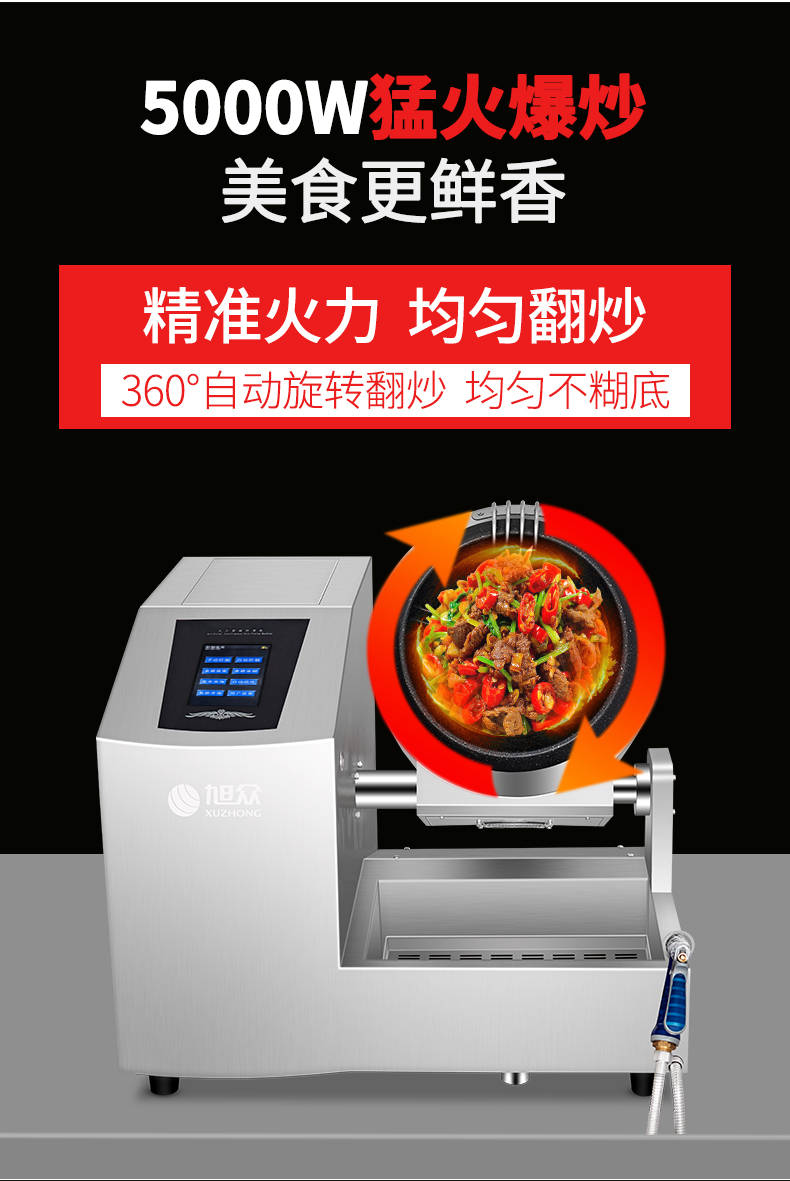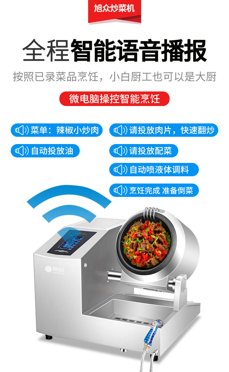 XZ-30TCP臺(tái)式300智能電磁炒菜機(jī)(觸屏+噴料),可以實(shí)現(xiàn)自動(dòng)化烹飪過(guò)程的智能化設(shè)備,語(yǔ)音播報(bào)、自動(dòng)噴料、旋轉(zhuǎn)翻炒、快速出菜。實(shí)現(xiàn)自動(dòng)化烹飪,新一代微電腦操控智能烹飪?cè)O(shè)備、顛覆傳統(tǒng)炒菜模式。5000W猛火爆炒美食更鮮香