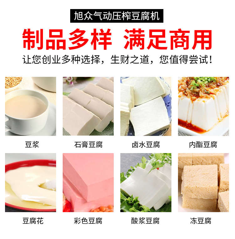 XZ-300型氣動壓榨豆腐機,智能豆腐豆?jié){機,雙桶煮漿高效生產現(xiàn)磨現(xiàn)煮,漿渣分離快速出漿。機器運行穩(wěn)定不銹鋼材質打造,堅固耐用,安全衛(wèi)生,時尚大方,易于清洗。