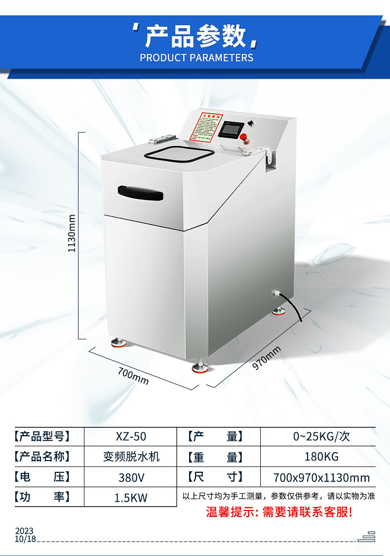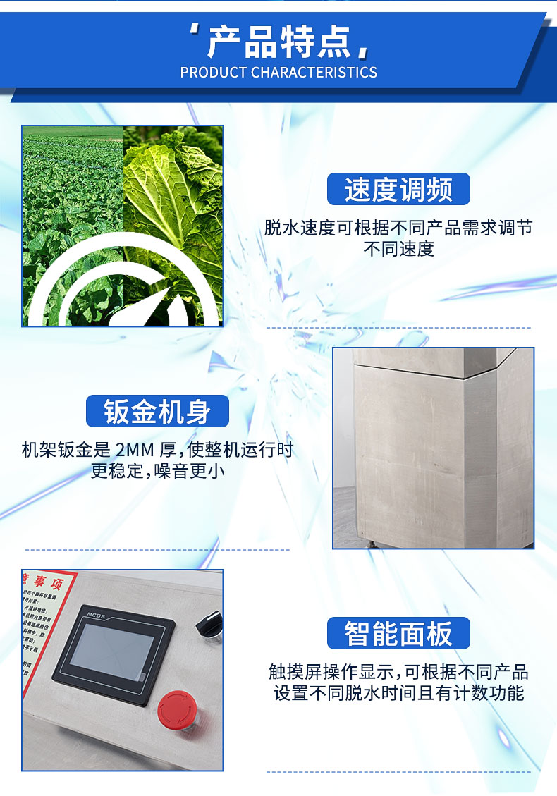 XZ-50型脫水機,蔬菜脫水食品甩干,變頻控制、方便快捷。速度調頻,脫水速度可根據(jù)不同產(chǎn)品需求調節(jié)不同速度。鈑金機身,機架鈑金是 2MM 厚,使整機運行時更穩(wěn)定,噪音更小。