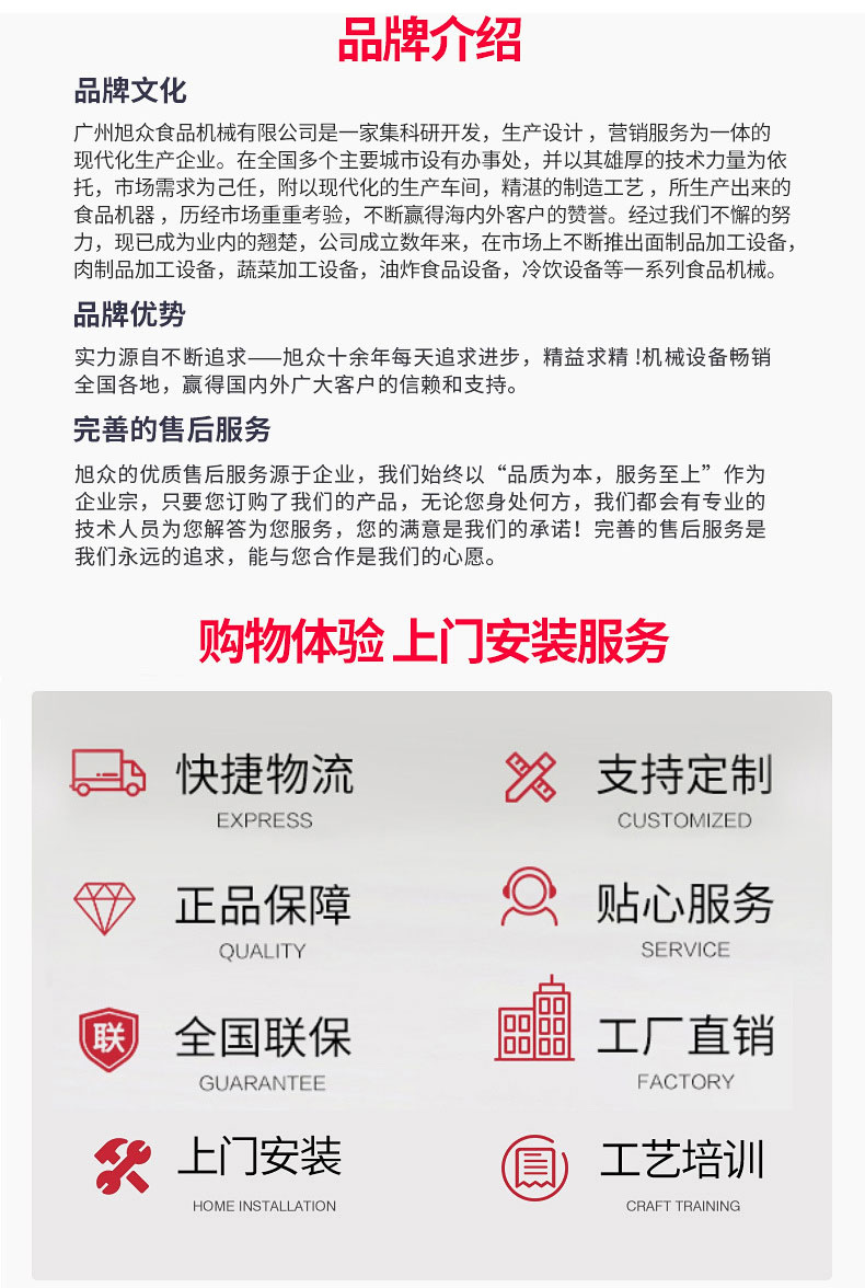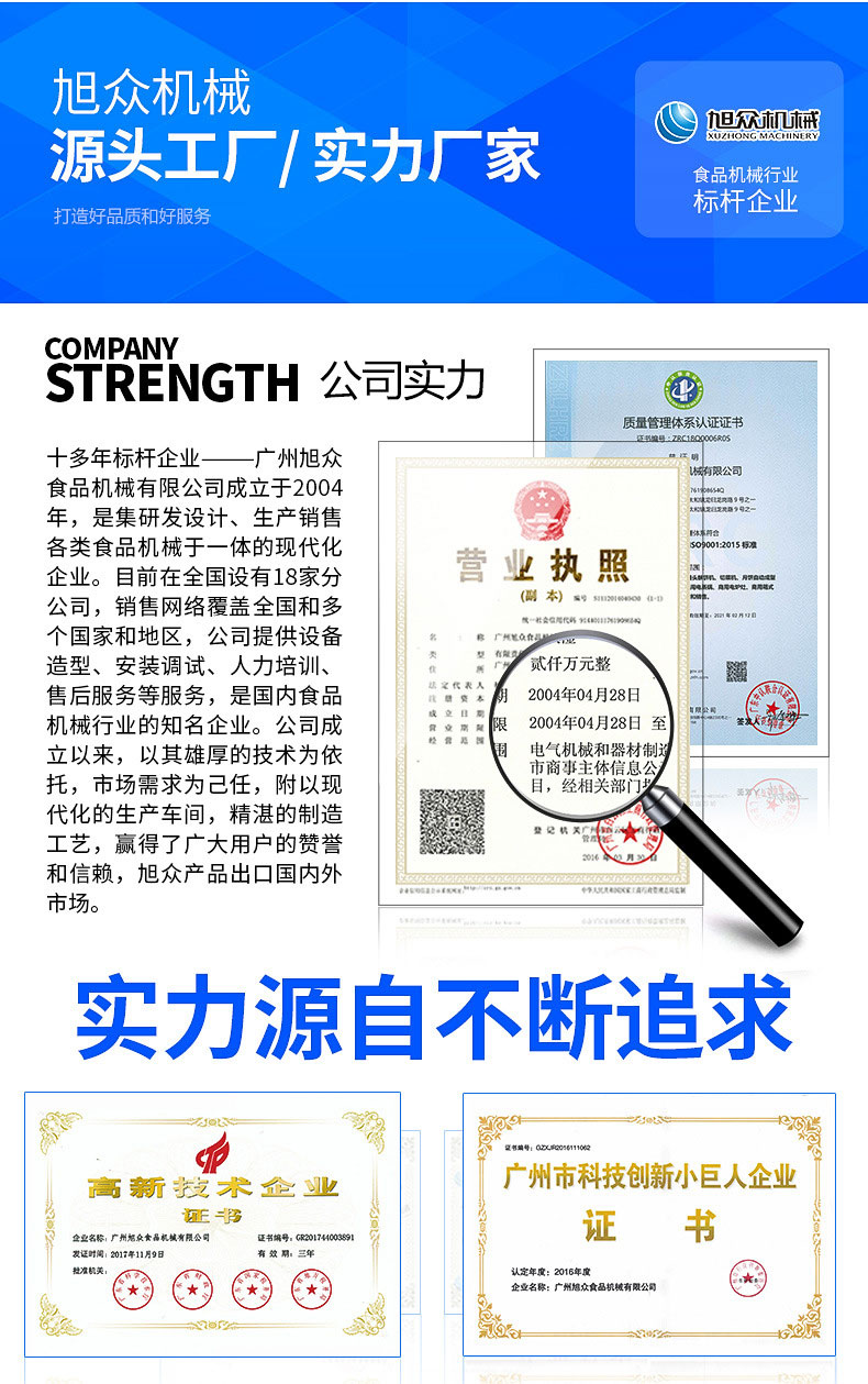 廣州旭眾食品機械有限公司是一家集科研開發(fā),生產(chǎn)設計,營銷服務為一體的現(xiàn)代化生產(chǎn)企業(yè)?,F(xiàn)代化生產(chǎn)車間,精湛制造技術,所產(chǎn)機械歷經(jīng)市場重重考驗,不斷贏得海內外客戶的贊譽。