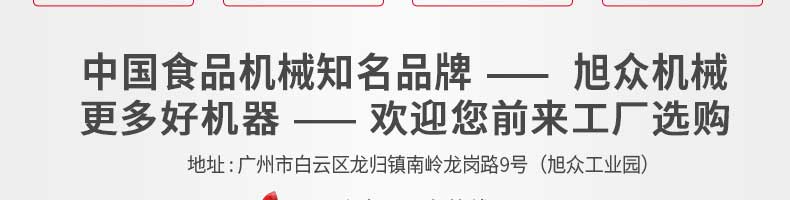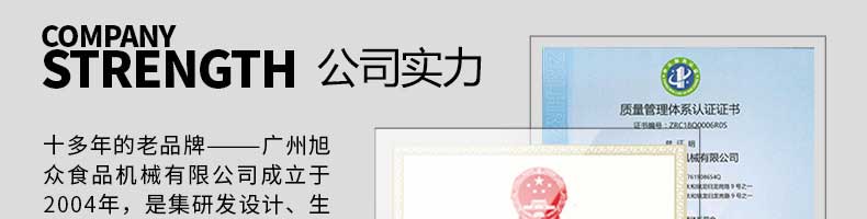 廣州旭眾食品機(jī)械有限公司是一家集科研開(kāi)發(fā),生產(chǎn)設(shè)計(jì),營(yíng)銷服務(wù)為一體的現(xiàn)代化生產(chǎn)企業(yè)。現(xiàn)代化生產(chǎn)車間,精湛制造技術(shù),所產(chǎn)機(jī)械歷經(jīng)市場(chǎng)重重考驗(yàn),不斷贏得海內(nèi)外客戶的贊譽(yù)。