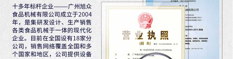 廣州旭眾食品機械有限公司是一家集科研開發(fā),生產(chǎn)設(shè)計,營銷服務(wù)為一體的現(xiàn)代化生產(chǎn)企業(yè)。現(xiàn)代化生產(chǎn)車間,精湛制造技術(shù),所產(chǎn)機械歷經(jīng)市場重重考驗,不斷贏得海內(nèi)外客戶的贊譽。