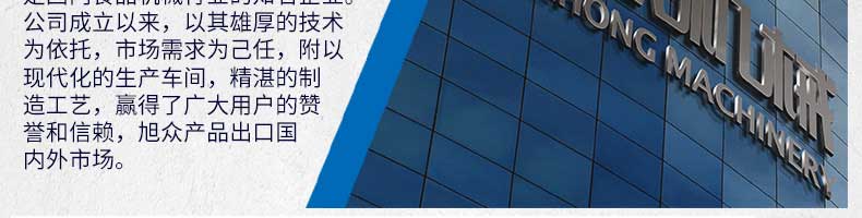 廣州旭眾食品機械有限公司是一家集科研開發(fā),生產(chǎn)設計,營銷服務為一體的現(xiàn)代化生產(chǎn)企業(yè)。現(xiàn)代化生產(chǎn)車間,精湛制造技術,所產(chǎn)機械歷經(jīng)市場重重考驗,不斷贏得海內外客戶的贊譽。