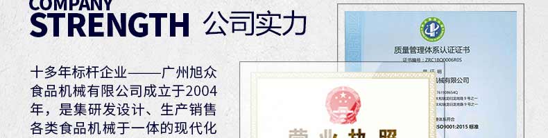 廣州旭眾食品機(jī)械有限公司是一家集科研開發(fā),生產(chǎn)設(shè)計(jì),營銷服務(wù)為一體的現(xiàn)代化生產(chǎn)企業(yè)?,F(xiàn)代化生產(chǎn)車間,精湛制造技術(shù),所產(chǎn)機(jī)械歷經(jīng)市場(chǎng)重重考驗(yàn),不斷贏得海內(nèi)外客戶的贊譽(yù)。
