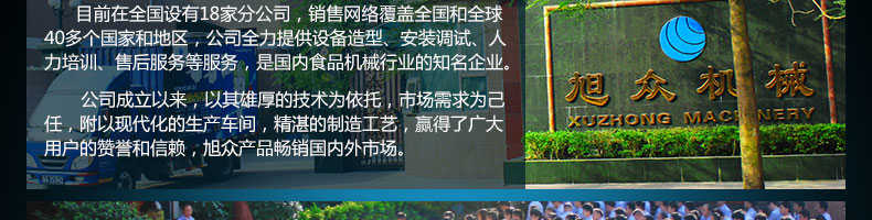 廣州旭眾食品機(jī)械有限公司是一家集科研開(kāi)發(fā),生產(chǎn)設(shè)計(jì),營(yíng)銷(xiāo)服務(wù)為一體的現(xiàn)代化生產(chǎn)企業(yè)?,F(xiàn)代化生產(chǎn)車(chē)間,精湛制造技術(shù),所產(chǎn)機(jī)械歷經(jīng)市場(chǎng)重重考驗(yàn),不斷贏(yíng)得海內(nèi)外客戶(hù)的贊譽(yù)。