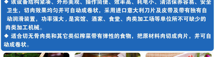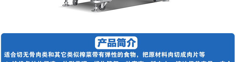 SA-350H 全自動(dòng)落地式切片機(jī),適合切無骨肉類和其他類似榨菜帶有彈性的食物,把原材料肉切成肉片,并可自動(dòng)成卷狀。可切牛肉片、羊肉片等