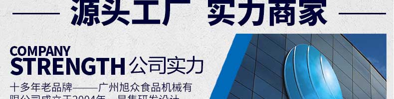 廣州旭眾食品機(jī)械有限公司是一家集科研開發(fā),生產(chǎn)設(shè)計(jì),營(yíng)銷服務(wù)為一體的現(xiàn)代化生產(chǎn)企業(yè)?,F(xiàn)代化生產(chǎn)車間,精湛制造技術(shù),所產(chǎn)機(jī)械歷經(jīng)市場(chǎng)重重考驗(yàn),不斷贏得海內(nèi)外客戶的贊譽(yù)。