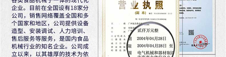 廣州旭眾食品機(jī)械有限公司是一家集科研開發(fā),生產(chǎn)設(shè)計(jì),營(yíng)銷服務(wù)為一體的現(xiàn)代化生產(chǎn)企業(yè)?,F(xiàn)代化生產(chǎn)車間,精湛制造技術(shù),所產(chǎn)機(jī)械歷經(jīng)市場(chǎng)重重考驗(yàn),不斷贏得海內(nèi)外客戶的贊譽(yù)。