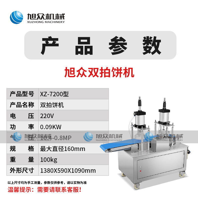 XZ-7200型雙拍餅機(jī),雙氣缸雙拍餅機(jī)雙氣缸分兩次拍扁,大大提高了產(chǎn)品的優(yōu)良性;拍的更均勻平整。搭配酥餅杋、月餅機(jī)、糍粑機(jī)使用。告別手工、更高效率。讓拍餅機(jī)改變生活,降低手工成本,省去繁瑣的手工工序,提高生活品質(zhì)。
