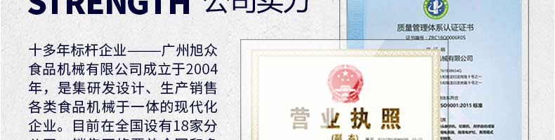 廣州旭眾食品機(jī)械有限公司是一家集科研開發(fā),生產(chǎn)設(shè)計(jì),營銷服務(wù)為一體的現(xiàn)代化生產(chǎn)企業(yè)?,F(xiàn)代化生產(chǎn)車間,精湛制造技術(shù),所產(chǎn)機(jī)械歷經(jīng)市場重重考驗(yàn),不斷贏得海內(nèi)外客戶的贊譽(yù)。