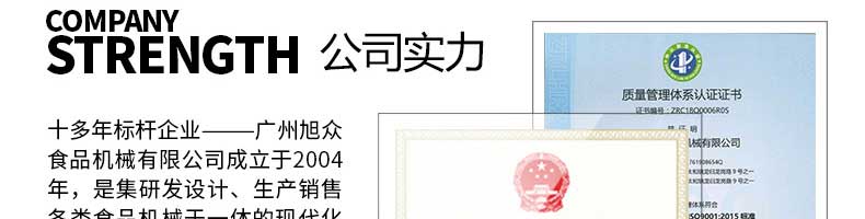 廣州旭眾食品機(jī)械有限公司是一家集科研開發(fā),生產(chǎn)設(shè)計(jì),營銷服務(wù)為一體的現(xiàn)代化生產(chǎn)企業(yè)。現(xiàn)代化生產(chǎn)車間,精湛制造技術(shù),所產(chǎn)機(jī)械歷經(jīng)市場重重考驗(yàn),不斷贏得海內(nèi)外客戶的贊譽(yù)。
