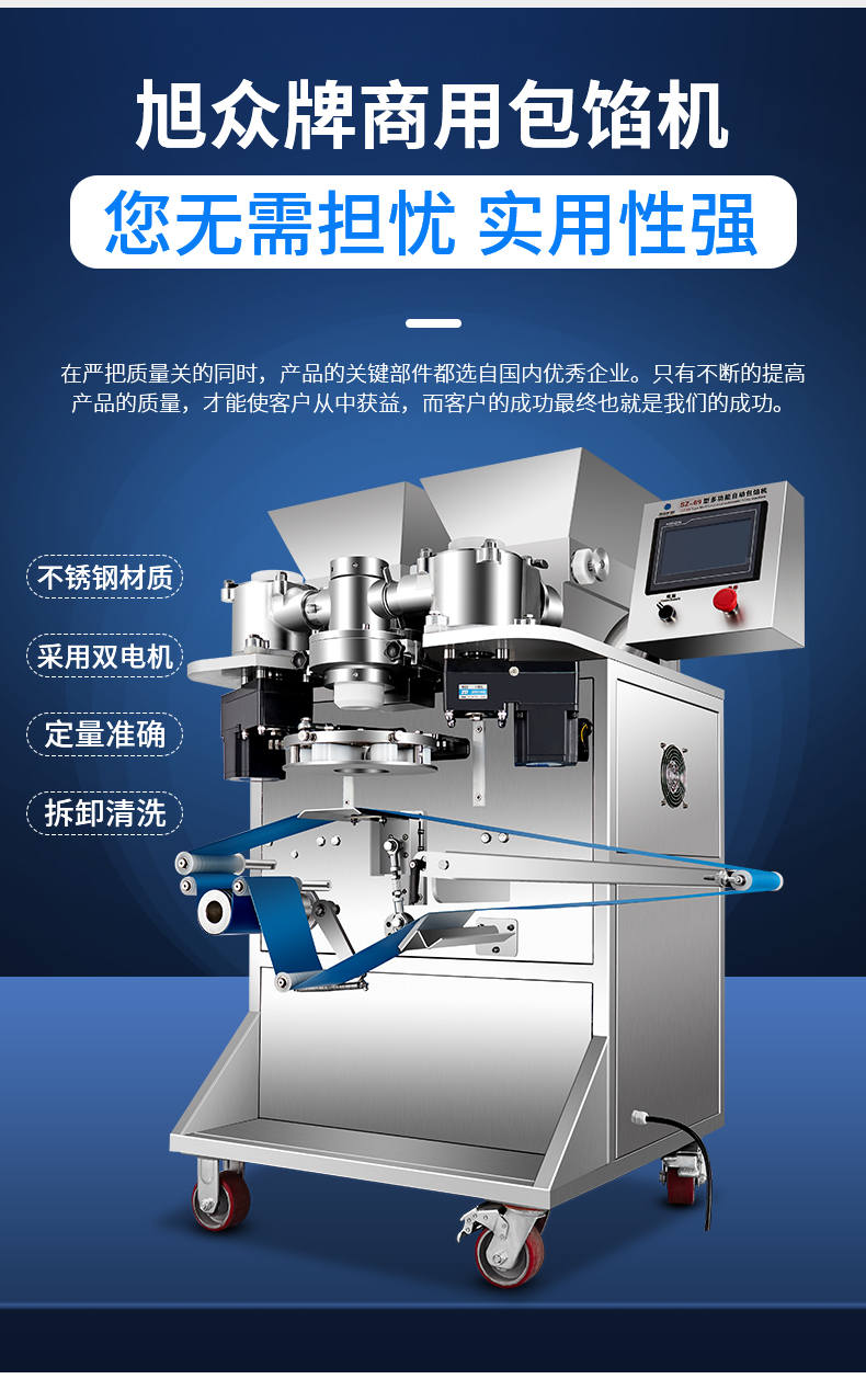 SZ-69型多功能自動(dòng)包餡機(jī),餡斗/面斗,可整個(gè)拆卸清洗,增加了自動(dòng)拔料功能。月餅鳳梨酥紅桃裸湯圓南瓜餅軟餡餅。在嚴(yán)把質(zhì)量關(guān)的同時(shí),產(chǎn)品的關(guān)鍵部件都選自國內(nèi)優(yōu)秀企業(yè)。只有不斷的提高產(chǎn)品的質(zhì)量,才能使客戶從中獲益,而客戶的成功最終也就是我們的成功。