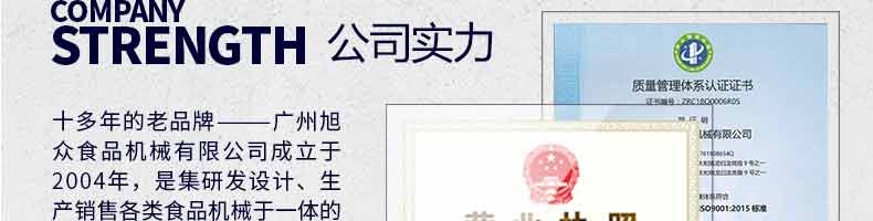 廣州旭眾食品機械有限公司是一家集科研開發(fā),生產(chǎn)設(shè)計,營銷服務(wù)為一體的現(xiàn)代化生產(chǎn)企業(yè)?,F(xiàn)代化生產(chǎn)車間,精湛制造技術(shù),所產(chǎn)機械歷經(jīng)市場重重考驗,不斷贏得海內(nèi)外客戶的贊譽。