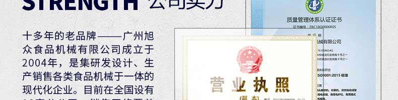 廣州旭眾食品機(jī)械有限公司是一家集科研開(kāi)發(fā),生產(chǎn)設(shè)計(jì),營(yíng)銷(xiāo)服務(wù)為一體的現(xiàn)代化生產(chǎn)企業(yè)。現(xiàn)代化生產(chǎn)車(chē)間,精湛制造技術(shù),所產(chǎn)機(jī)械歷經(jīng)市場(chǎng)重重考驗(yàn),不斷贏得海內(nèi)外客戶(hù)的贊譽(yù)。