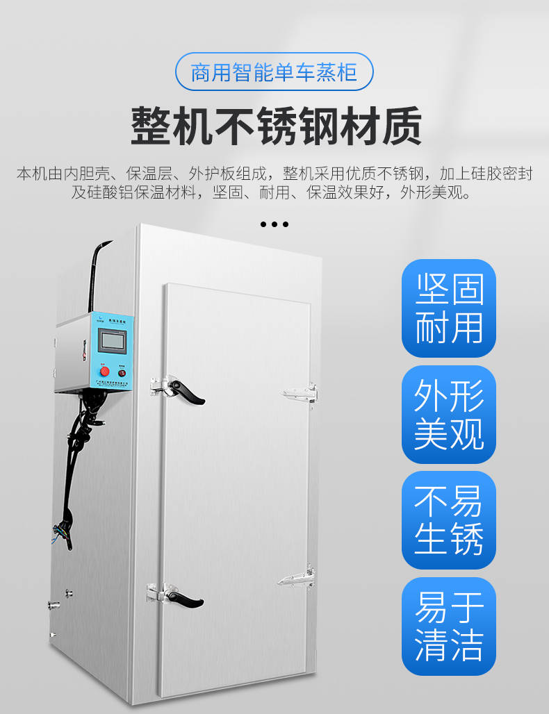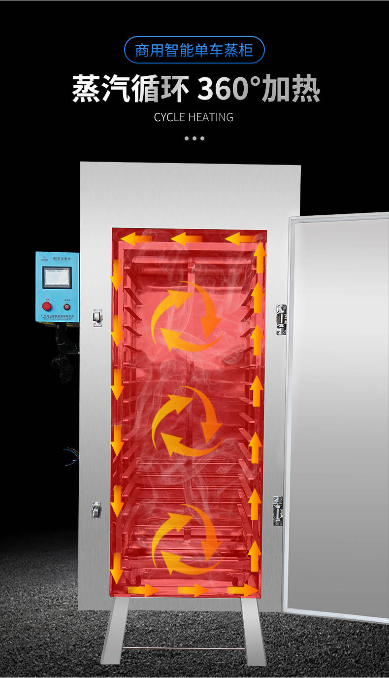 單車(chē)蒸柜,整機(jī)不銹鋼材質(zhì)本機(jī)由內(nèi)膽殼、保溫層、外護(hù)板組成,整機(jī)采用優(yōu)質(zhì)不銹鋼,加上硅膠密封及硅酸鋁保溫材料,堅(jiān)固、耐用、保溫效果好,外形美觀。循環(huán)均勻發(fā)熱,專(zhuān)門(mén)用于發(fā)熱管干燒空氣,溫度任意調(diào)節(jié),讓食物口感怡到好吃