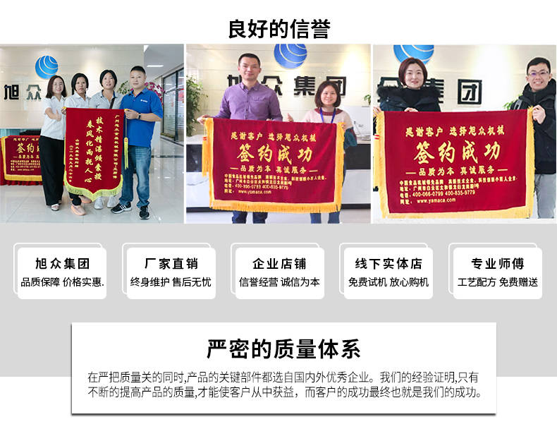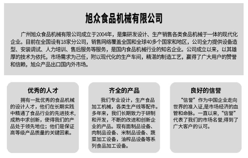 廣州旭眾食品機(jī)械有限公司是一家集科研開(kāi)發(fā),生產(chǎn)設(shè)計(jì),營(yíng)銷(xiāo)服務(wù)為一體的現(xiàn)代化生產(chǎn)企業(yè)?,F(xiàn)代化生產(chǎn)車(chē)間,精湛制造技術(shù),所產(chǎn)機(jī)械歷經(jīng)市場(chǎng)重重考驗(yàn),不斷贏得海內(nèi)外客戶的贊譽(yù)。
