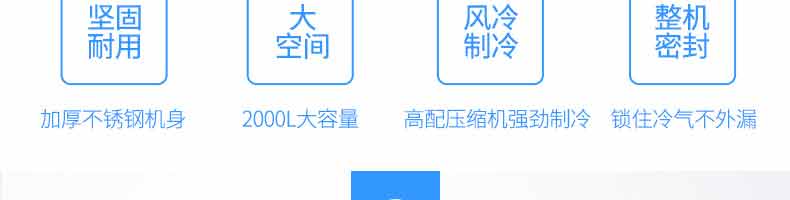 XZ-速凍柜,實(shí)力派,不妥協(xié)。4大強(qiáng)勢(shì)來(lái)襲,源自生活所需。堅(jiān)固耐用、大空間、風(fēng)冷制冷、整機(jī)密封、加厚不銹鋼機(jī)身,2000L大容量,高配壓縮機(jī)強(qiáng)勁制,令鎖住冷氣不外漏。