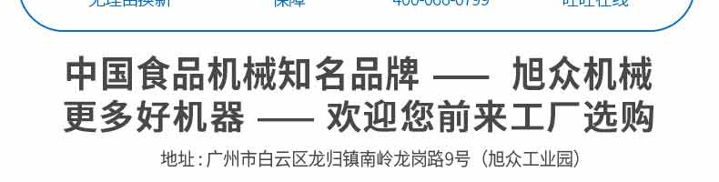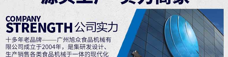 廣州旭眾食品機(jī)械有限公司是一家集科研開(kāi)發(fā),生產(chǎn)設(shè)計(jì),營(yíng)銷(xiāo)服務(wù)為一體的現(xiàn)代化生產(chǎn)企業(yè)?,F(xiàn)代化生產(chǎn)車(chē)間,精湛制造技術(shù),所產(chǎn)機(jī)械歷經(jīng)市場(chǎng)重重考驗(yàn),不斷贏得海內(nèi)外客戶的贊譽(yù)。