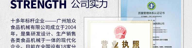 廣州旭眾食品機(jī)械有限公司是一家集科研開發(fā),生產(chǎn)設(shè)計(jì),營銷服務(wù)為一體的現(xiàn)代化生產(chǎn)企業(yè)?,F(xiàn)代化生產(chǎn)車間,精湛制造技術(shù),所產(chǎn)機(jī)械歷經(jīng)市場(chǎng)重重考驗(yàn),不斷贏得海內(nèi)外客戶的贊譽(yù)。