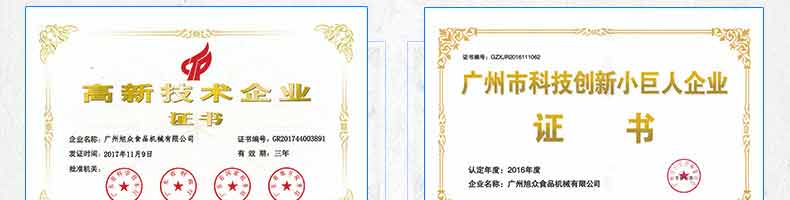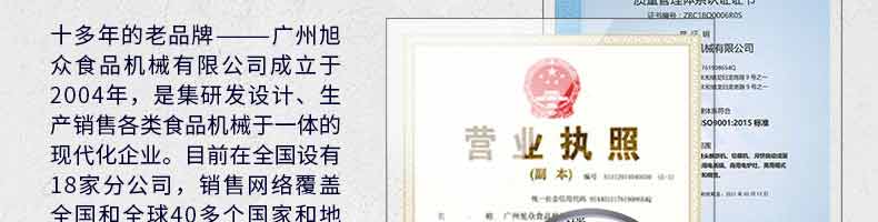 廣州旭眾食品機(jī)械有限公司是一家集科研開(kāi)發(fā),生產(chǎn)設(shè)計(jì),營(yíng)銷(xiāo)服務(wù)為一體的現(xiàn)代化生產(chǎn)企業(yè)?,F(xiàn)代化生產(chǎn)車(chē)間,精湛制造技術(shù),所產(chǎn)機(jī)械歷經(jīng)市場(chǎng)重重考驗(yàn),不斷贏得海內(nèi)外客戶的贊譽(yù)。