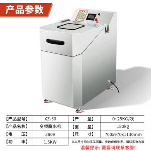 XZ-50型脫水機,蔬菜脫水食品甩干,變頻控制、方便快捷。速度調頻,脫水速度可根據(jù)不同產(chǎn)品需求調節(jié)不同速度。鈑金機身,機架鈑金是 2MM 厚,使整機運行時更穩(wěn)定,噪音更小。