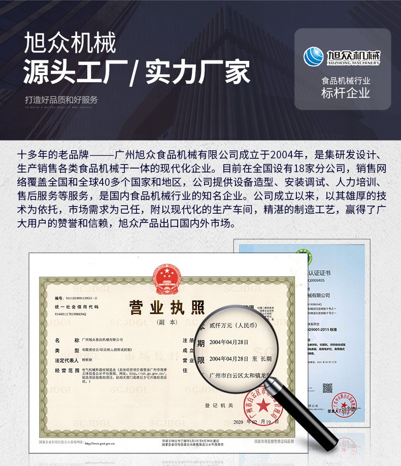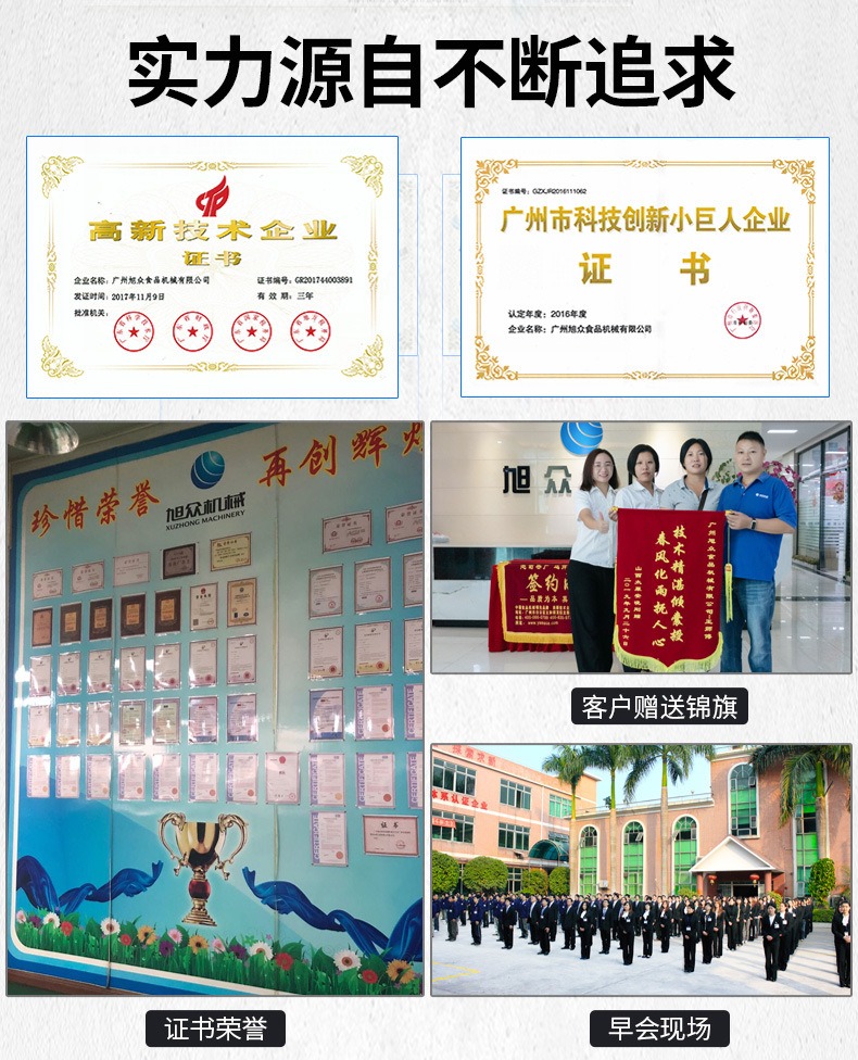 廣州旭眾食品機(jī)械有限公司是一家集科研開發(fā),生產(chǎn)設(shè)計(jì),營銷服務(wù)為一體的現(xiàn)代化生產(chǎn)企業(yè)。現(xiàn)代化生產(chǎn)車間,精湛制造技術(shù),所產(chǎn)機(jī)械歷經(jīng)市場重重考驗(yàn),不斷贏得海內(nèi)外客戶的贊譽(yù)。
