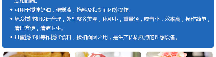 SZM-40、50、60攪拌機(jī)系列,可用于攪拌奶油、蛋糕液、餡料及和制面團(tuán)等操作。打蛋攪拌機(jī)等作攪拌食料、揉和面團(tuán)之用,是生產(chǎn)優(yōu)質(zhì)糕點(diǎn)的理想設(shè)備,適用于酒店、飯店、學(xué)校部門、面包屋以及食品廠家。