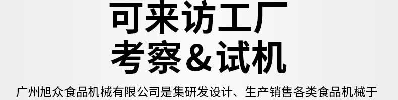 廣州旭眾食品機(jī)械有限公司是一家集科研開(kāi)發(fā),生產(chǎn)設(shè)計(jì),營(yíng)銷服務(wù)為一體的現(xiàn)代化生產(chǎn)企業(yè)。現(xiàn)代化生產(chǎn)車間,精湛制造技術(shù),所產(chǎn)機(jī)械歷經(jīng)市場(chǎng)重重考驗(yàn),不斷贏得海內(nèi)外客戶的贊譽(yù)。