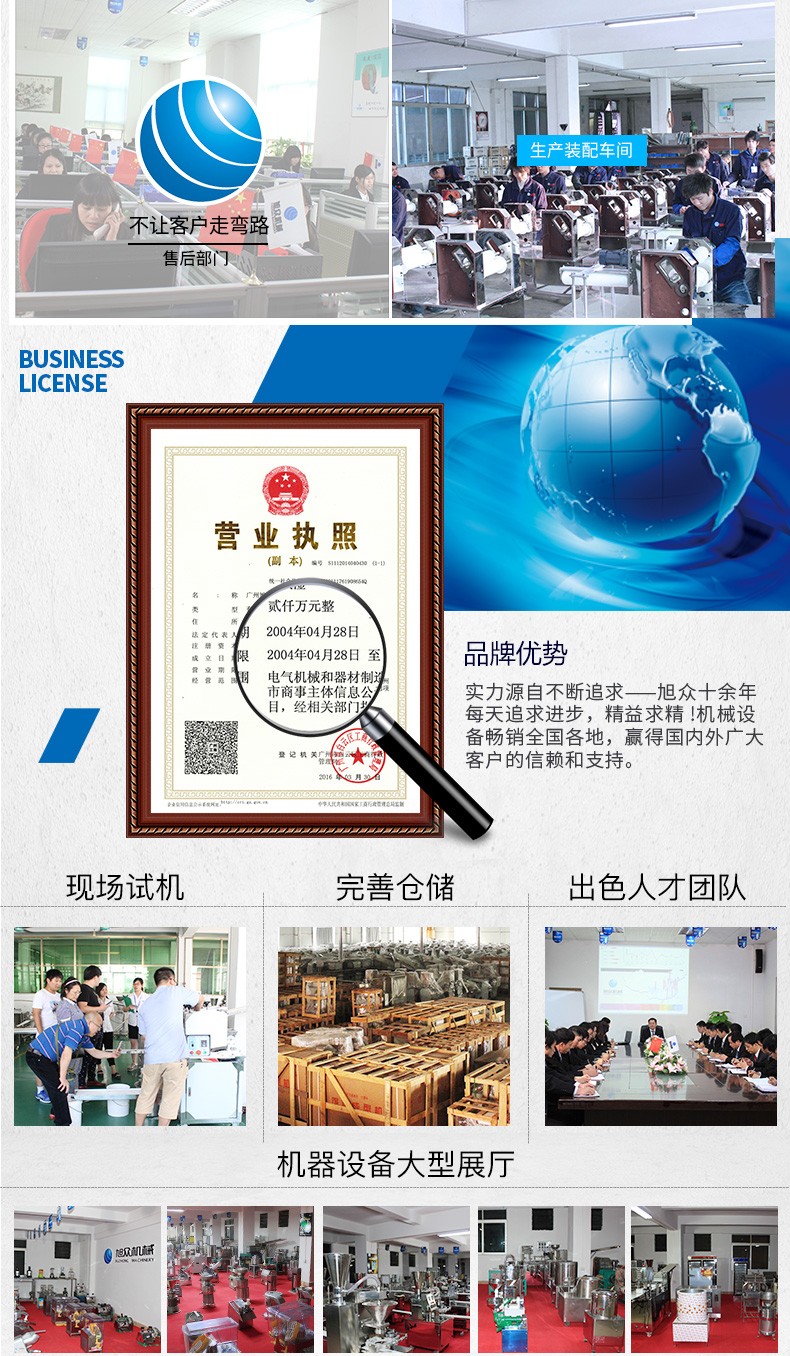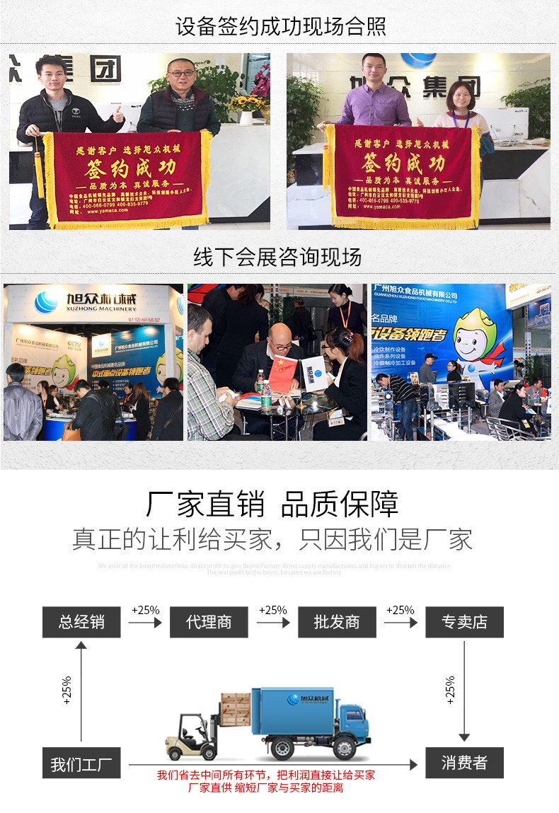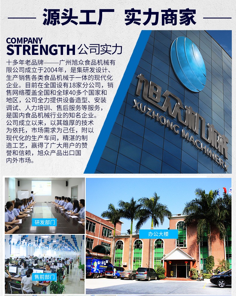 廣州旭眾食品機械有限公司是一家集科研開發(fā),生產(chǎn)設計,營銷服務為一體的現(xiàn)代化生產(chǎn)企業(yè)?,F(xiàn)代化生產(chǎn)車間,精湛制造技術(shù),所產(chǎn)機械歷經(jīng)市場重重考驗,不斷贏得海內(nèi)外客戶的贊譽。