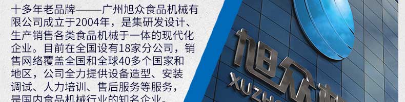 廣州旭眾食品機械有限公司是一家集科研開發(fā),生產(chǎn)設計,營銷服務為一體的現(xiàn)代化生產(chǎn)企業(yè)。現(xiàn)代化生產(chǎn)車間,精湛制造技術,所產(chǎn)機械歷經(jīng)市場重重考驗,不斷贏得海內外客戶的贊譽。