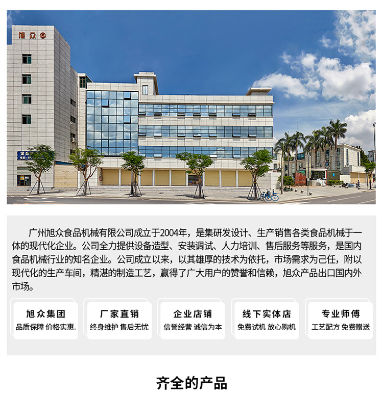 廣州旭眾食品機(jī)械有限公司是一家集科研開發(fā),生產(chǎn)設(shè)計,營銷服務(wù)為一體的現(xiàn)代化生產(chǎn)企業(yè)。現(xiàn)代化生產(chǎn)車間,精湛制造技術(shù),所產(chǎn)機(jī)械歷經(jīng)市場重重考驗(yàn),不斷贏得海內(nèi)外客戶的贊譽(yù)。