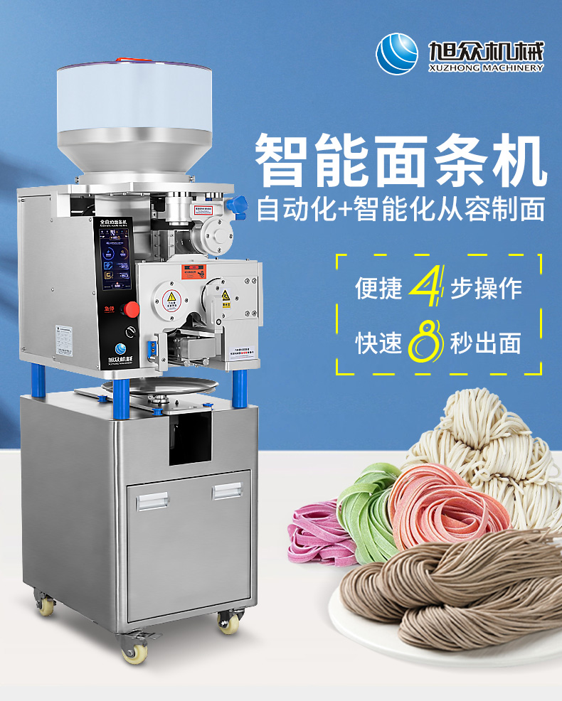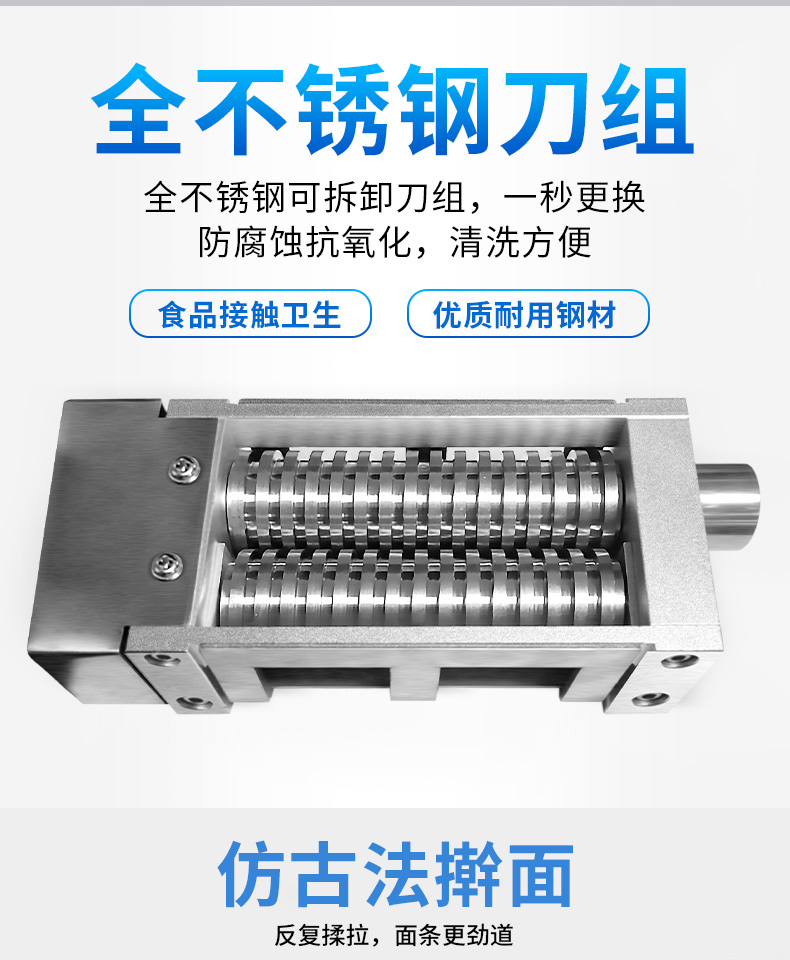 XZ-M800面條機,制作多種面條:拉面、小面、牛肉面、韭葉面板面、褲帯面、蔬菜面、水果面、雜糧面8秒快速出面人性化設(shè)計,更便捷更高效與同類型機器相比,出面更快、秒換刀具。全不銹鋼刀組全不銹鋼可拆卸刀組,一秒更換防腐蝕抗氧化,清洗方便。