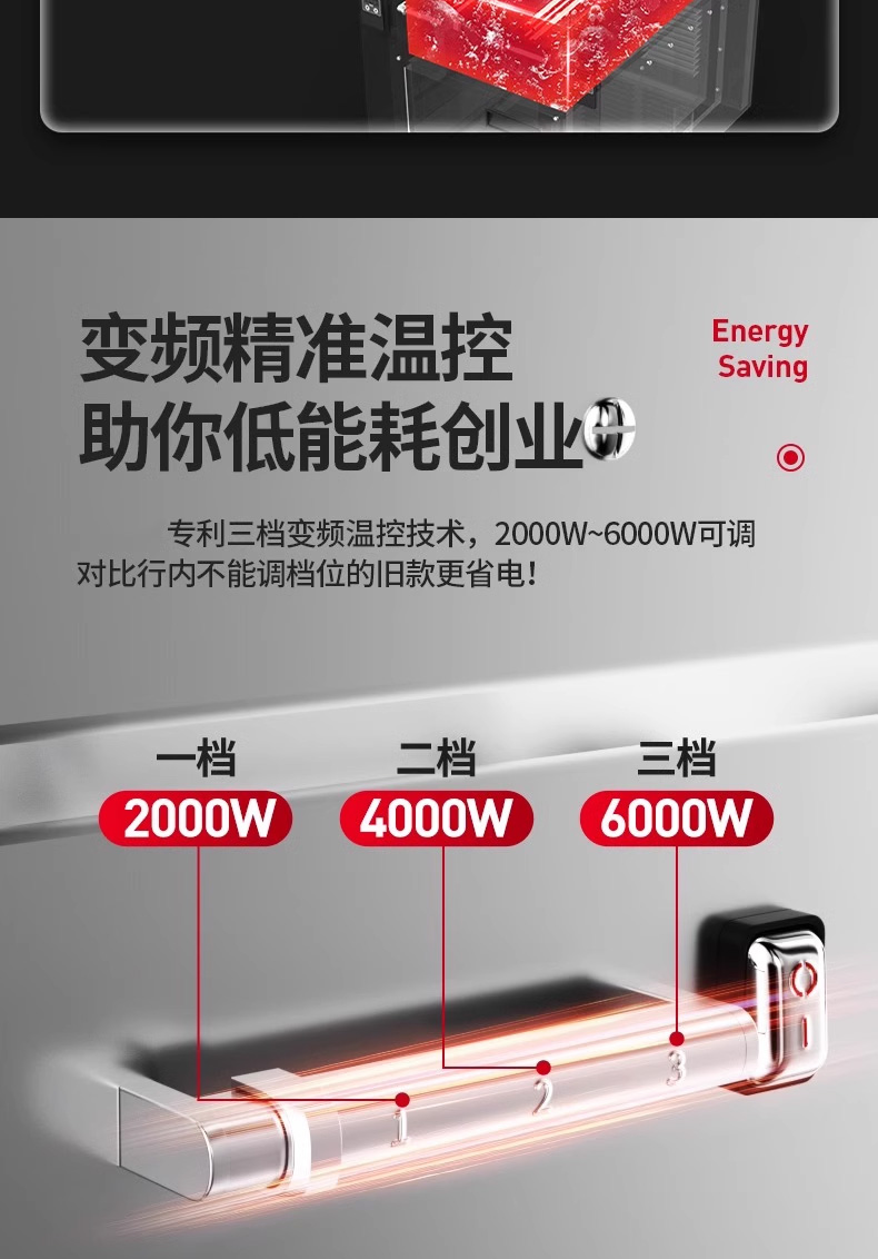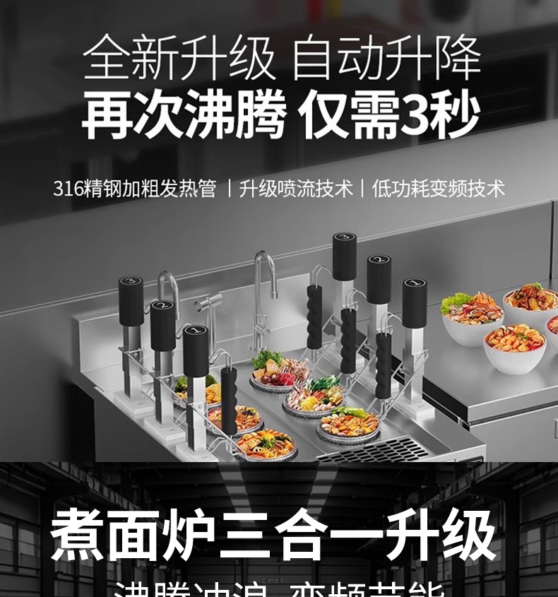 三合一煮面爐,全新升級,自動升降再次沸騰,僅需3秒。316精鋼加粗發(fā)熱管、升級噴流技術(shù)、低功耗變頻技術(shù)。煮面爐三合一升級,沸騰沖浪、變頻節(jié)能。