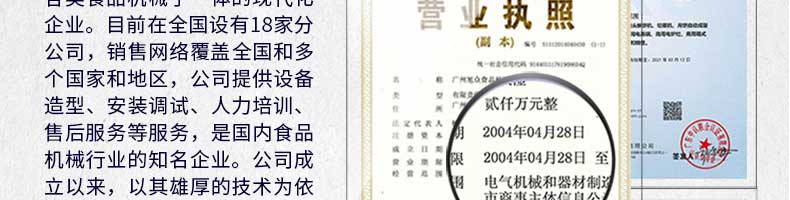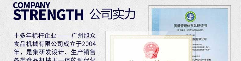 廣州旭眾食品機(jī)械有限公司是一家集科研開發(fā),生產(chǎn)設(shè)計(jì),營(yíng)銷服務(wù)為一體的現(xiàn)代化生產(chǎn)企業(yè)?,F(xiàn)代化生產(chǎn)車間,精湛制造技術(shù),所產(chǎn)機(jī)械歷經(jīng)市場(chǎng)重重考驗(yàn),不斷贏得海內(nèi)外客戶的贊譽(yù)。