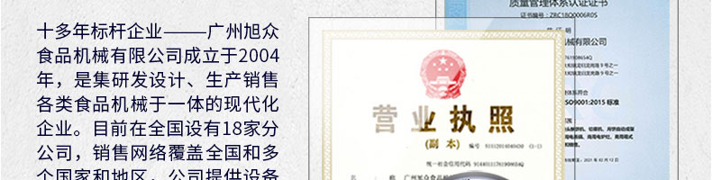 廣州旭眾食品機(jī)械有限公司是一家集科研開(kāi)發(fā),生產(chǎn)設(shè)計(jì),營(yíng)銷服務(wù)為一體的現(xiàn)代化生產(chǎn)企業(yè)。現(xiàn)代化生產(chǎn)車間,精湛制造技術(shù),所產(chǎn)機(jī)械歷經(jīng)市場(chǎng)重重考驗(yàn),不斷贏得海內(nèi)外客戶的贊譽(yù)。