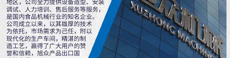 廣州旭眾食品機(jī)械有限公司是一家集科研開發(fā),生產(chǎn)設(shè)計(jì),營銷服務(wù)為一體的現(xiàn)代化生產(chǎn)企業(yè)?,F(xiàn)代化生產(chǎn)車間,精湛制造技術(shù),所產(chǎn)機(jī)械歷經(jīng)市場重重考驗(yàn),不斷贏得海內(nèi)外客戶的贊譽(yù)。
