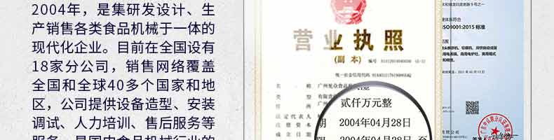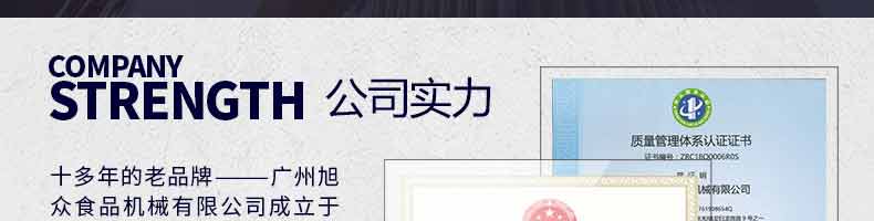廣州旭眾食品機械有限公司是一家集科研開發(fā),生產(chǎn)設計,營銷服務為一體的現(xiàn)代化生產(chǎn)企業(yè)?,F(xiàn)代化生產(chǎn)車間,精湛制造技術(shù),所產(chǎn)機械歷經(jīng)市場重重考驗,不斷贏得海內(nèi)外客戶的贊譽。