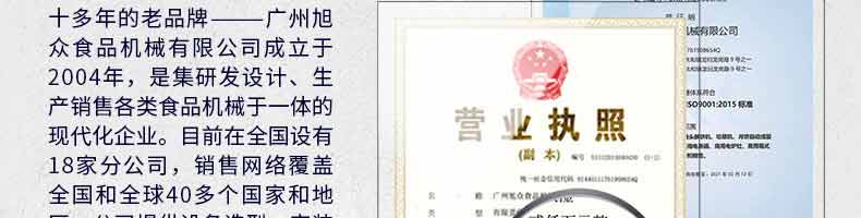 廣州旭眾食品機械有限公司是一家集科研開發(fā),生產(chǎn)設計,營銷服務為一體的現(xiàn)代化生產(chǎn)企業(yè)。現(xiàn)代化生產(chǎn)車間,精湛制造技術,所產(chǎn)機械歷經(jīng)市場重重考驗,不斷贏得海內(nèi)外客戶的贊譽。