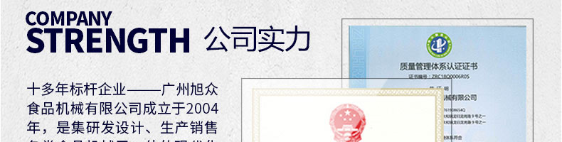 廣州旭眾食品機械有限公司是一家集科研開發(fā),生產(chǎn)設(shè)計,營銷服務(wù)為一體的現(xiàn)代化生產(chǎn)企業(yè)?,F(xiàn)代化生產(chǎn)車間,精湛制造技術(shù),所產(chǎn)機械歷經(jīng)市場重重考驗,不斷贏得海內(nèi)外客戶的贊譽。