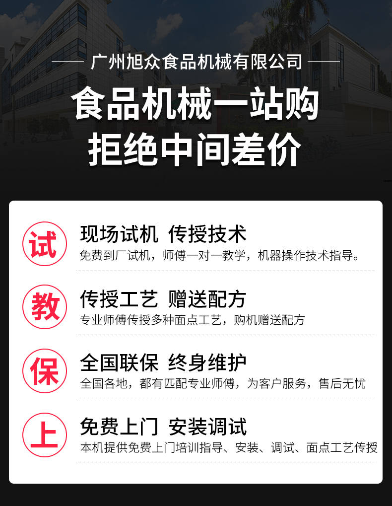 廣州旭眾食品機(jī)械有限公司是一家集科研開發(fā),生產(chǎn)設(shè)計(jì),營銷服務(wù)為一體的現(xiàn)代化生產(chǎn)企業(yè)?,F(xiàn)代化生產(chǎn)車間,精湛制造技術(shù),所產(chǎn)機(jī)械歷經(jīng)市場(chǎng)重重考驗(yàn),不斷贏得海內(nèi)外客戶的贊譽(yù)。