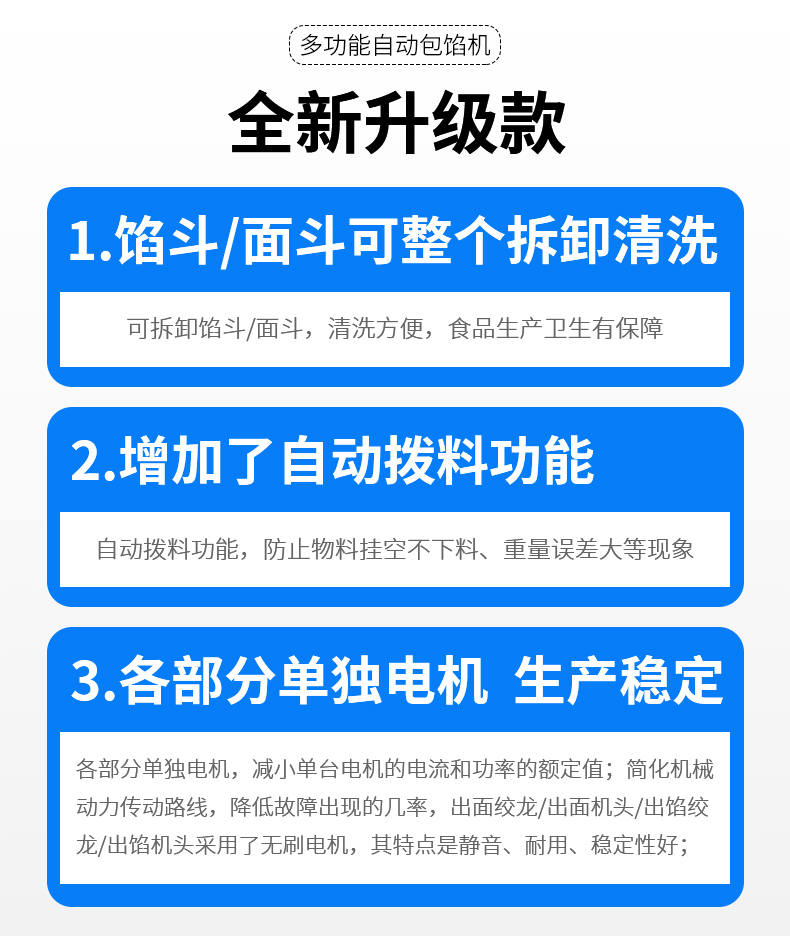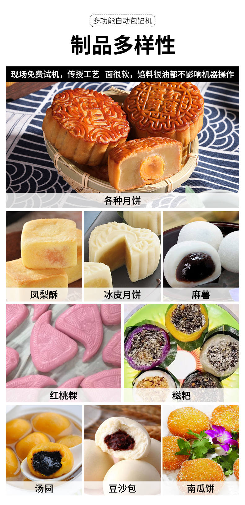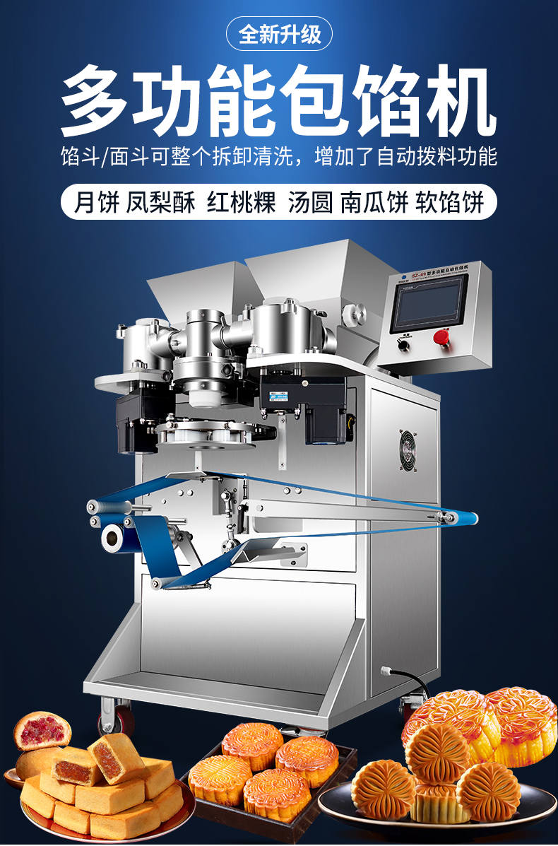 SZ-69型多功能自動(dòng)包餡機(jī),餡斗/面斗,可整個(gè)拆卸清洗,增加了自動(dòng)拔料功能。月餅鳳梨酥紅桃裸湯圓南瓜餅軟餡餅。在嚴(yán)把質(zhì)量關(guān)的同時(shí),產(chǎn)品的關(guān)鍵部件都選自國內(nèi)優(yōu)秀企業(yè)。只有不斷的提高產(chǎn)品的質(zhì)量,才能使客戶從中獲益,而客戶的成功最終也就是我們的成功。