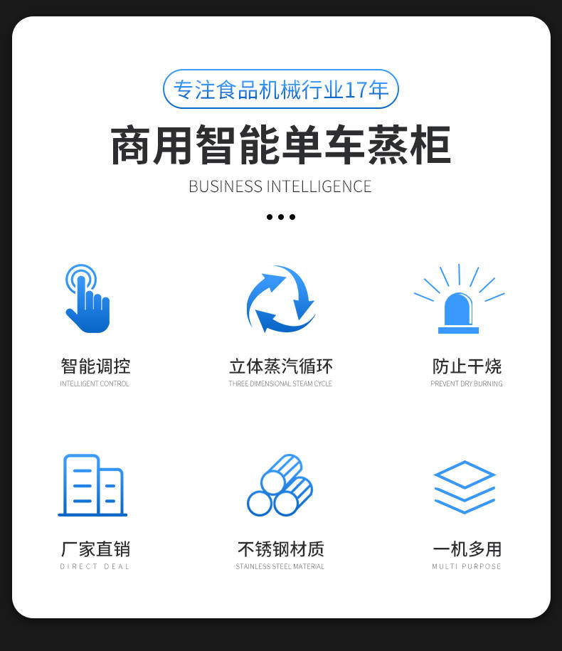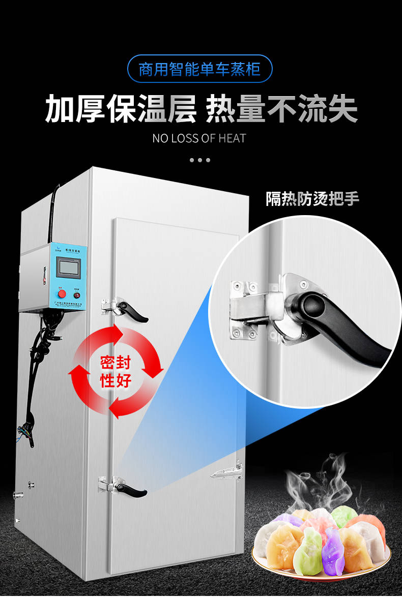 單車(chē)蒸柜,整機(jī)不銹鋼材質(zhì)本機(jī)由內(nèi)膽殼、保溫層、外護(hù)板組成,整機(jī)采用優(yōu)質(zhì)不銹鋼,加上硅膠密封及硅酸鋁保溫材料,堅(jiān)固、耐用、保溫效果好,外形美觀。循環(huán)均勻發(fā)熱,專(zhuān)門(mén)用于發(fā)熱管干燒空氣,溫度任意調(diào)節(jié),讓食物口感怡到好吃